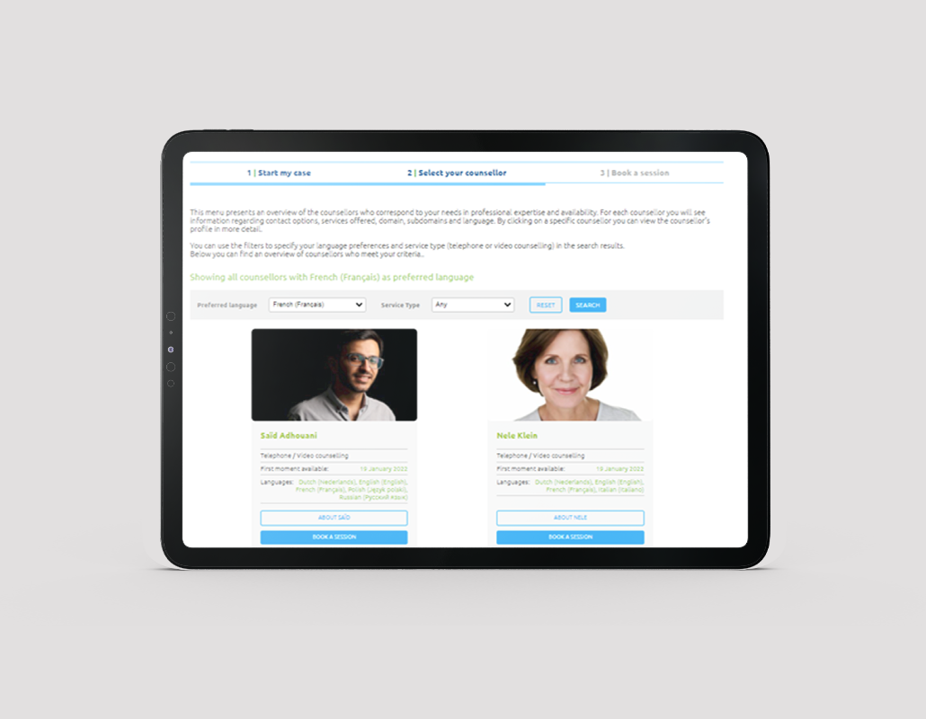 On the APPA platform, users can very confidentially describe their request for help, choose a care provider themselves based on various selection criteria, directly book counselling sessions, and receive quick and discreet advice and support in online video sessions. The APPA website is available free of charge 24 hours a day, 7 days a week.